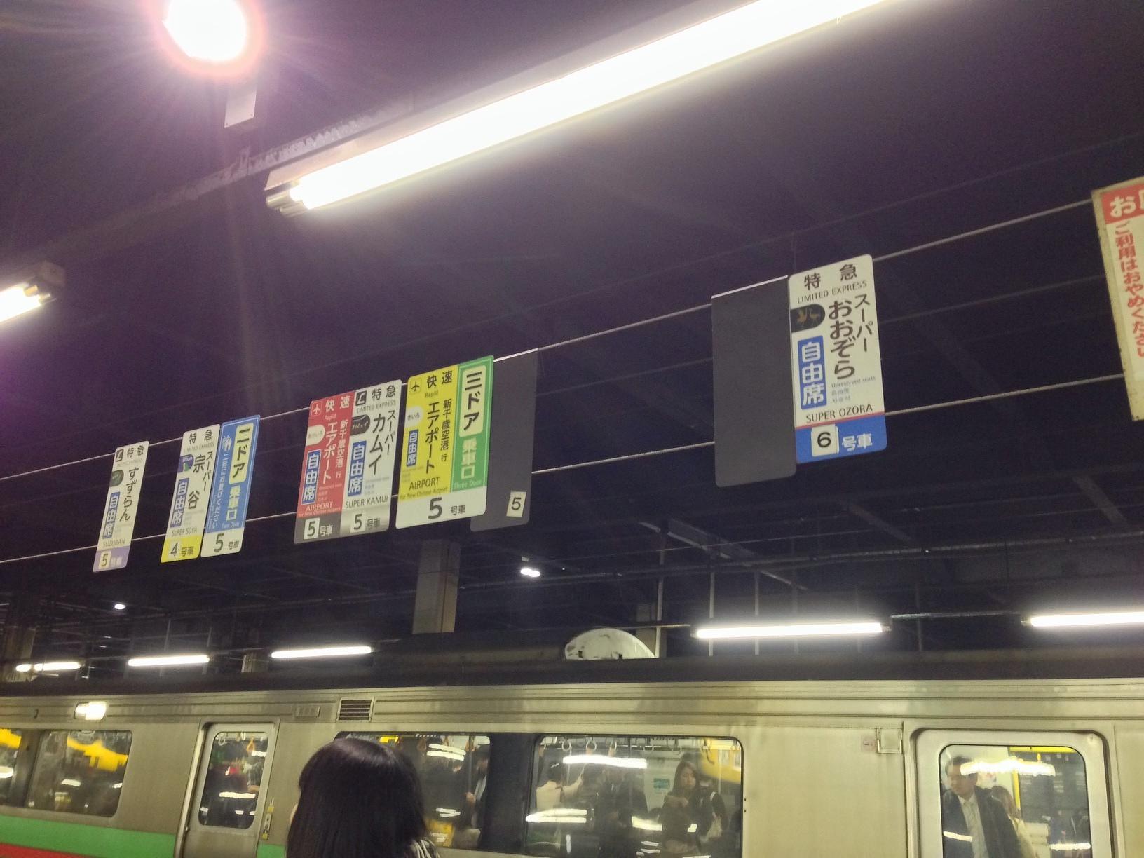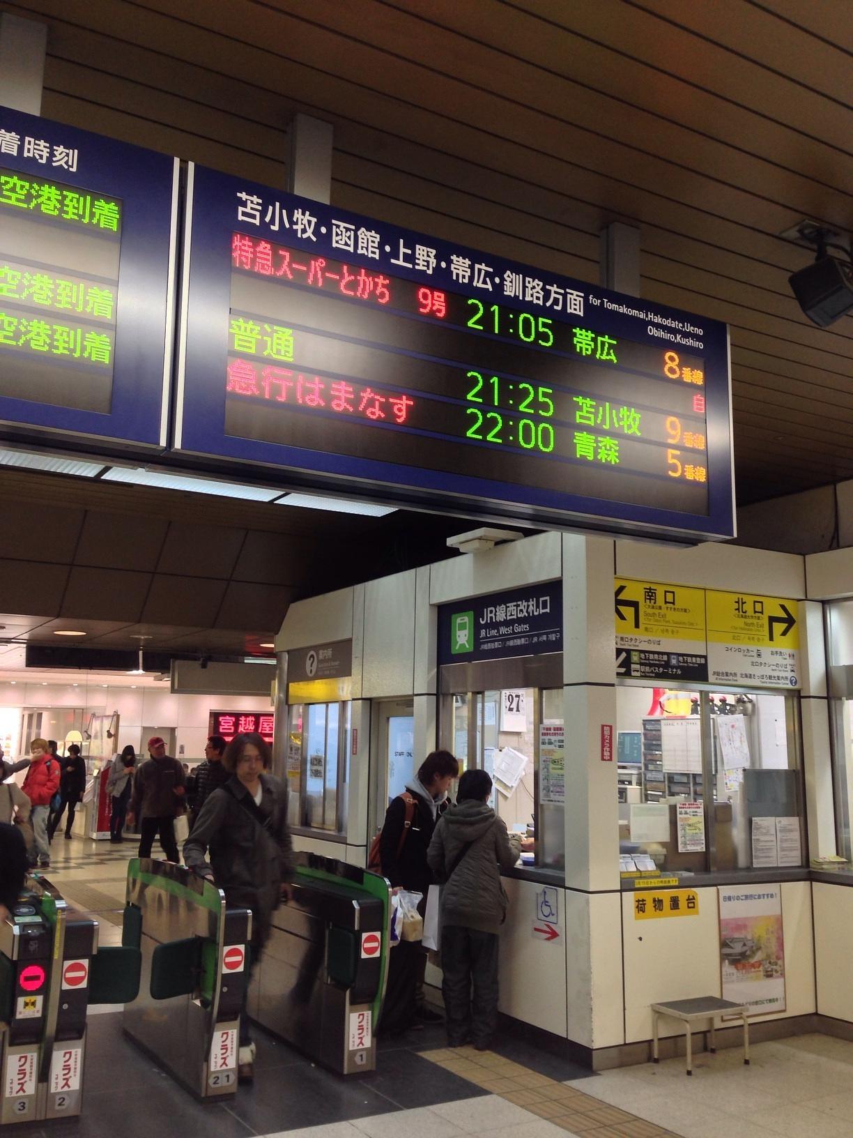 札幌駅 (Sapporo Sta.) Train Station 오후 10시에 삿포로 역에서 출발하는 야간열차 급행하마나스를 타고 내일 5시 40분에 아오모리 역에 도착할 예정입니다. March 27th, 2014, PM 9:03