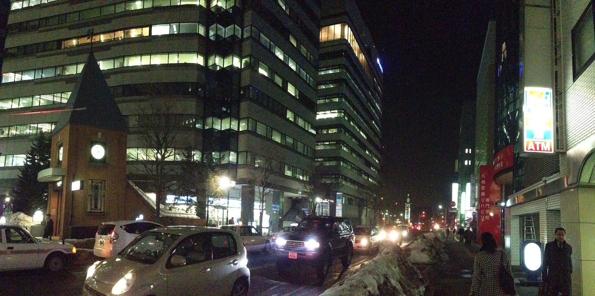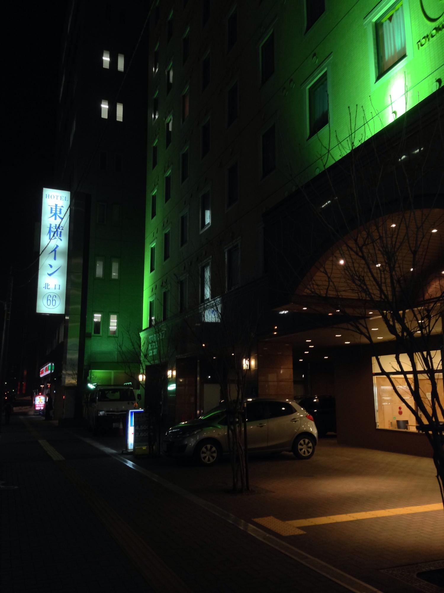 東横イン 札幌駅北口 (Toyoko Inn Sapporo-eki Kita-guchi) Hotel 왼쪽으로 보이는 시계 건물이 삿포로 지하철 역, 그 옆에 로손, 그 옆에 숙소, 그 앞에 세븐일레븐. 이야아아아아... March 25th, 2014, PM 7:56