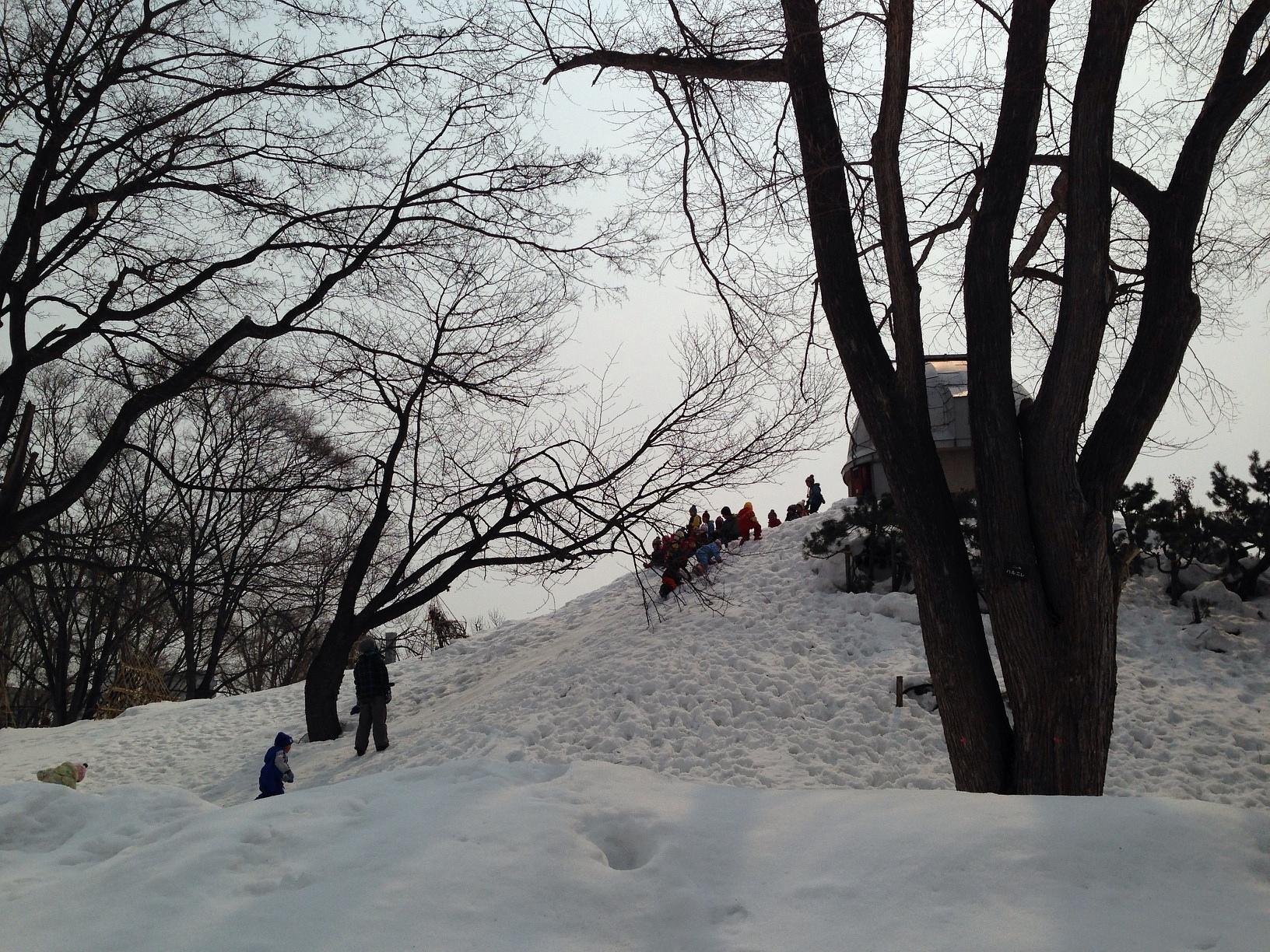 동네 유치원인지 아이들과 선생님이 아무 장비도 없이 공원에서 눈썰매를 타고 있다. 재미있어 보인다...